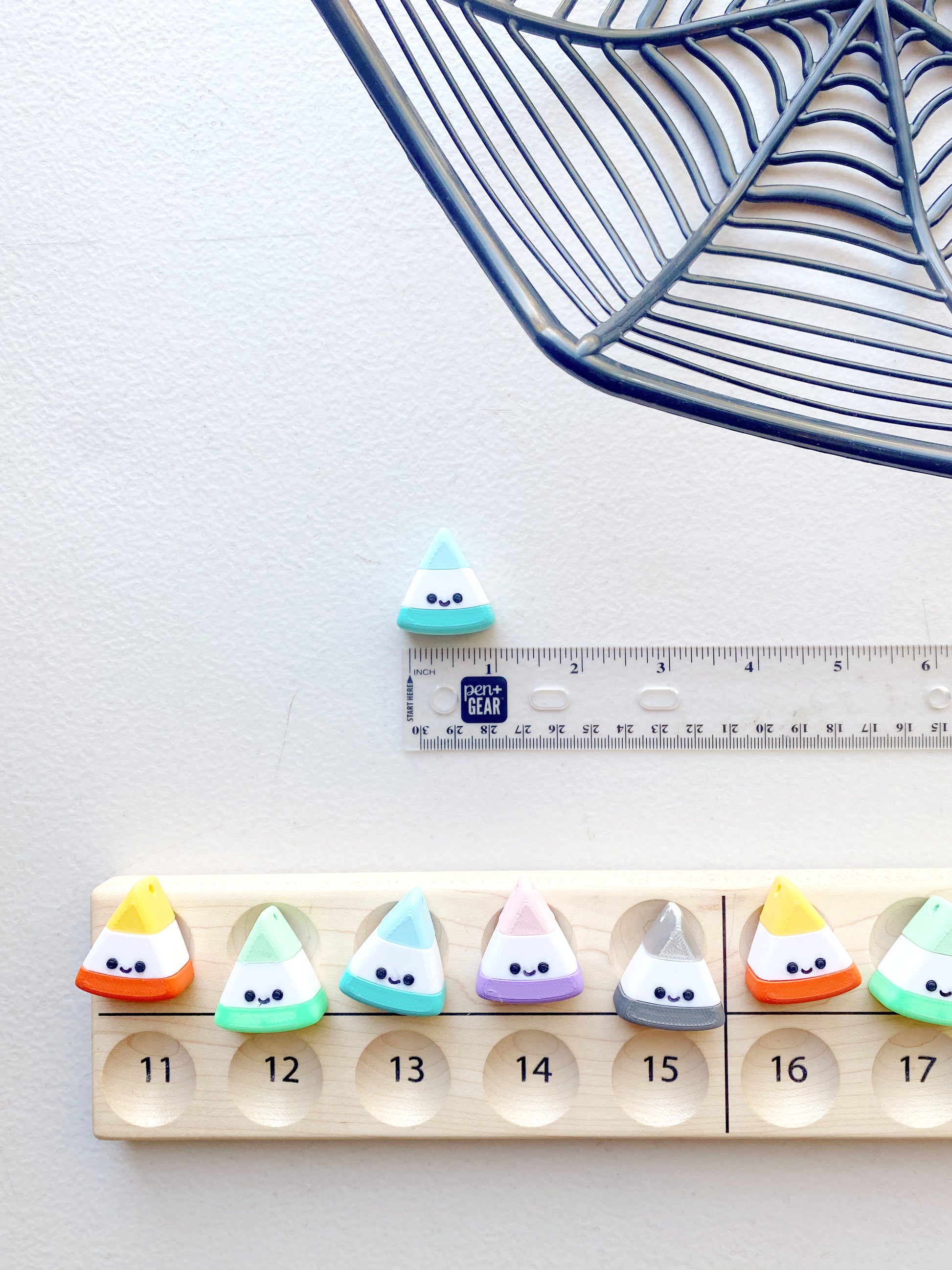 5 cutiepatootie 3d printed candy corn beads, 6 pattern replication cards, string, elastic, and a handful of beads to customize the necklace!