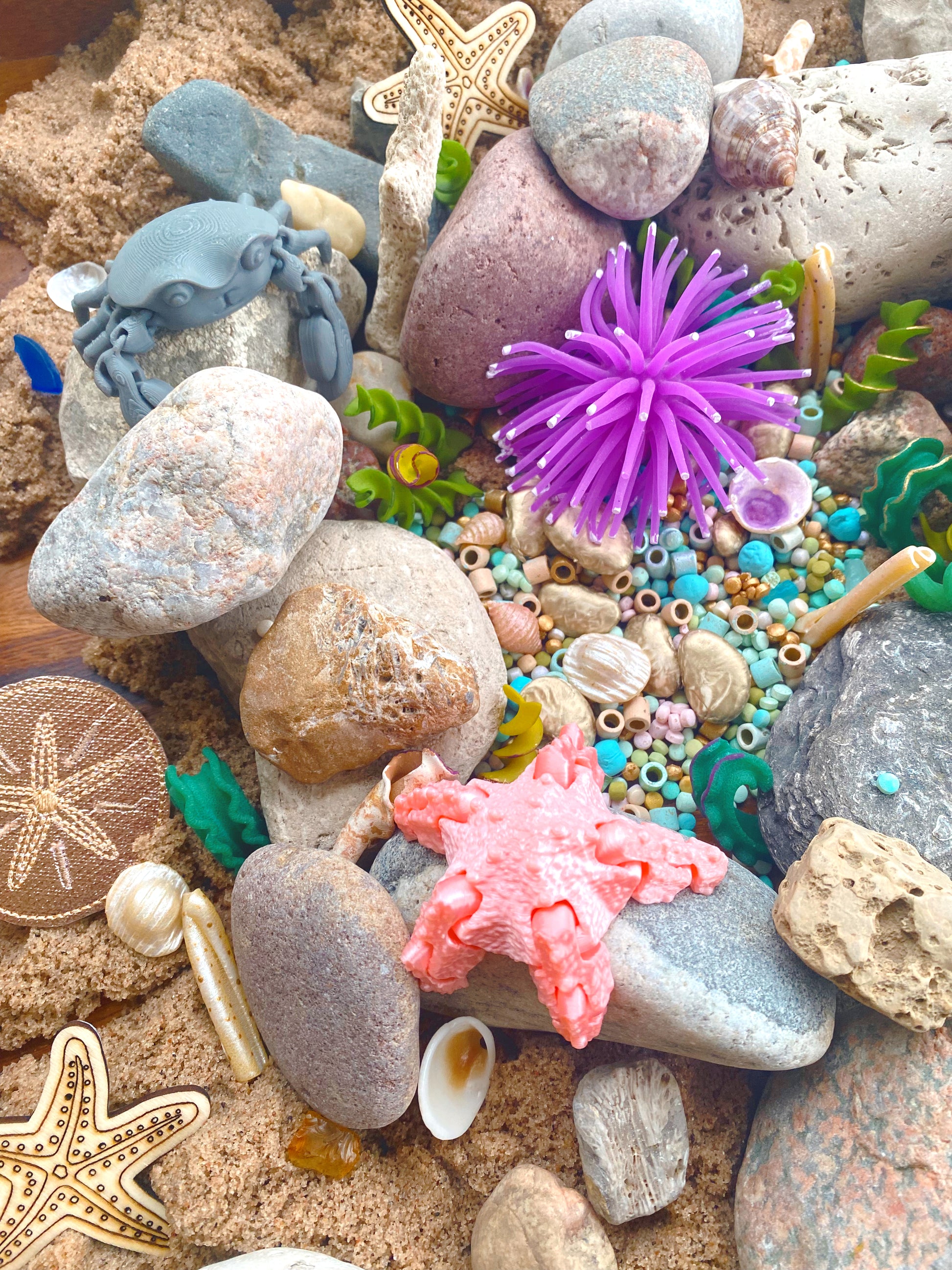 4 cups of beachy sensory filler, real shells and sea stars, an embroidered sand dollar, wiggly sea anemone, sea glass, hand painted pasta to look like shells and coral, and a 3d printed articulated sea star.